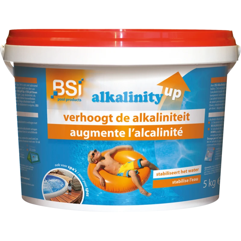 Avec BSI Alkalinity Up, vous pouvez augmenter l’alcalinité dans votre piscine ou votre bain à bulles. C’est un poudre à dissolution rapide qui ne laisse pas de résidus dans la piscine! L’alcalinité totale de l’eau de la piscine ou du bain à bulles donne une idée de la possibilité de tamponner (amortisser) les variations du pH lorsqu’on ajoute BSI pH Up ou BSI pH Down. L’alcalinité totale recommandée est de 80 – 150 ppm.