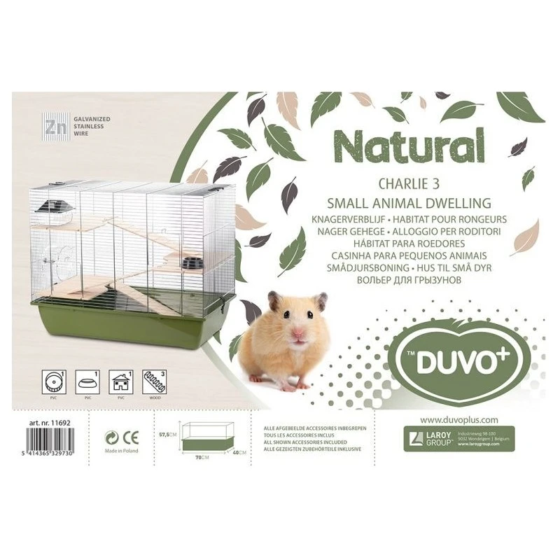 La cage pour rongeurs Natural Charlie 3 de Duvo+ est une cage de qualité supérieure au design amusant et dans une couleur naturelle. Cette cage renferme des accessoires en bois, une mangeoire, un abri, 3 échelles en bois et une passerelle. Cette cage est fabriquée en acier inoxydable et galvanisé 100% sûr pour vos rongeurs. Grâce aux accessoires amusants et aux 3 étages, votre rongeur ne s`ennuiera jamais. La partie supérieure de la cage est amovible pour faciliter le nettoyage. En outre, les différentes ouvertures permettent de donner facilement à manger et à boire à votre animal de compagnie.