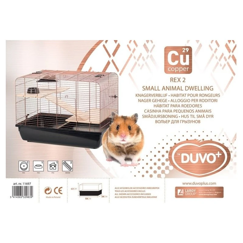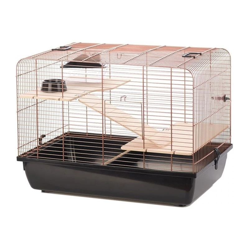 La cage pour rongeurs Copper Rex 2 de Duvo+ est une cage élégante et de qualité qui présente une finition en cuivre luxueuse associée à un bac de couleur noire. Cette cage renferme une mangeoire, une passerelle, un abri et 2 échelles en bois. Grâce aux accessoires amusants et aux 2 étages, votre rongeur ne s`ennuiera pas. La partie supérieure de la cage est amovible pour faciliter le nettoyage. En outre, les différentes ouvertures permettent de donner facilement à manger et à boire à votre animal de compagnie