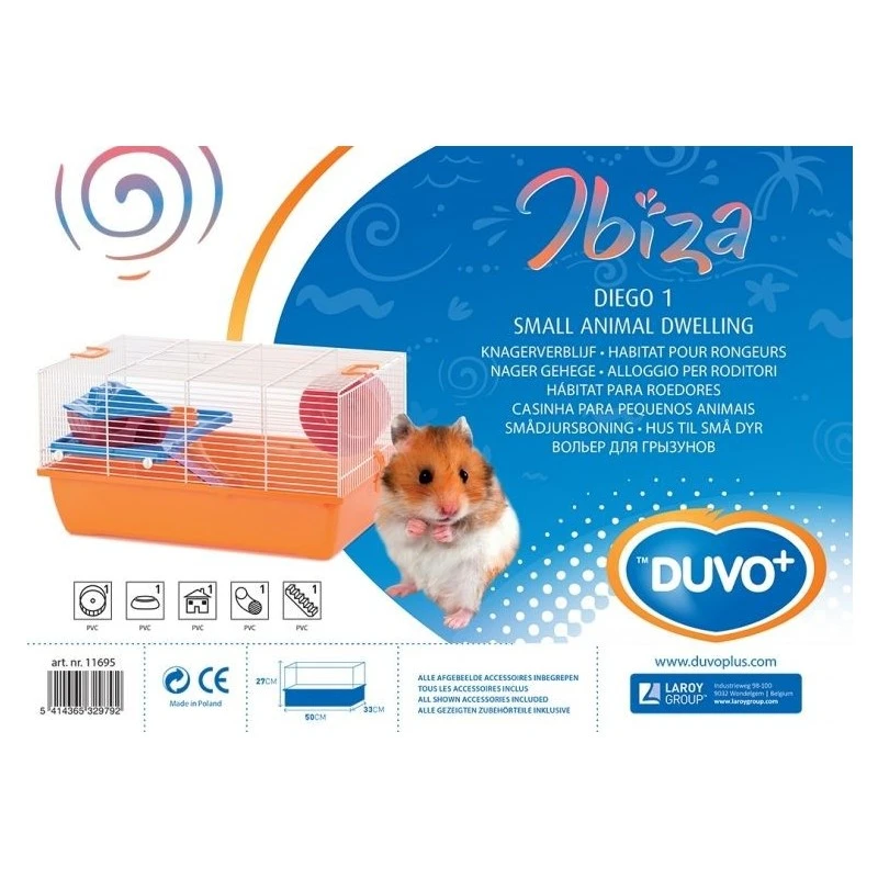 La cage pour rongeurs Ibiza Diego 1 de Duvo+ est une cage de qualité au design coloré. Cette cage renferme une mangeoire, une échelle, une passerelle, un tuyau et un abri. Grâce aux accessoires amusants, votre rongeur ne s`ennuiera pas. La partie supérieure de la cage est amovible pour faciliter le nettoyage.