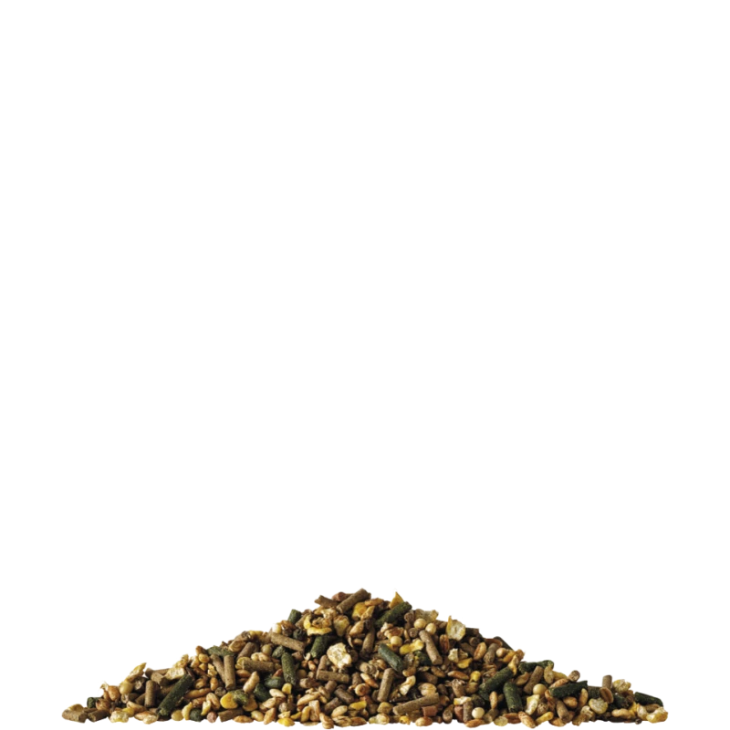 Luzerne, farine basse de blé, avoine, orge expansée, maïs expansé, aliment de soja (produit à partir de soja génétiquement modifié), son de blé, flocons d’orge, graines de lin, mélasse de betterave, gluten feed de blé, aliment de tournesol, coques de soja (produites à partir de soja génétiquement modifié), graines de soja toastées, blé, son d’épeautre, fibre de soja, remoulage de blé, carbonate de calcium, gluten feed de maïs, chlorure de sodium, huile de soja, graines oléagineuses concassées