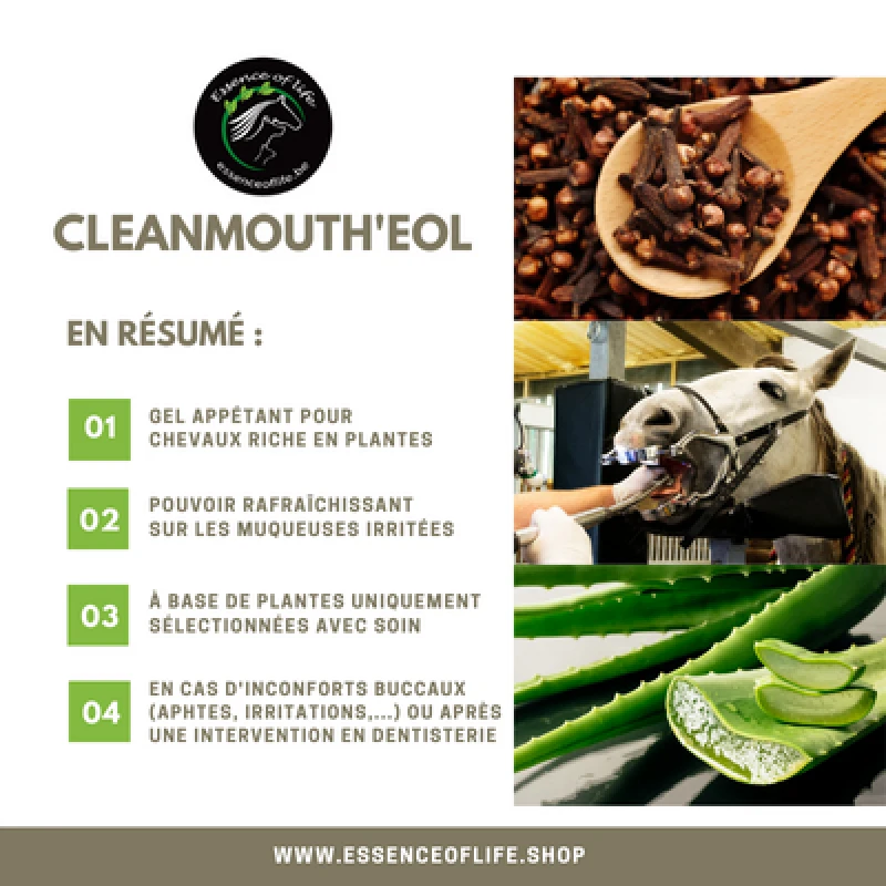 En effet, en collaboration avec Equibitfit et notre équipe de Vétérinaires, nous avons développé le CleanMouth’EOL pour fournir un nettoyant/soin post intervention en dentisterie équine.