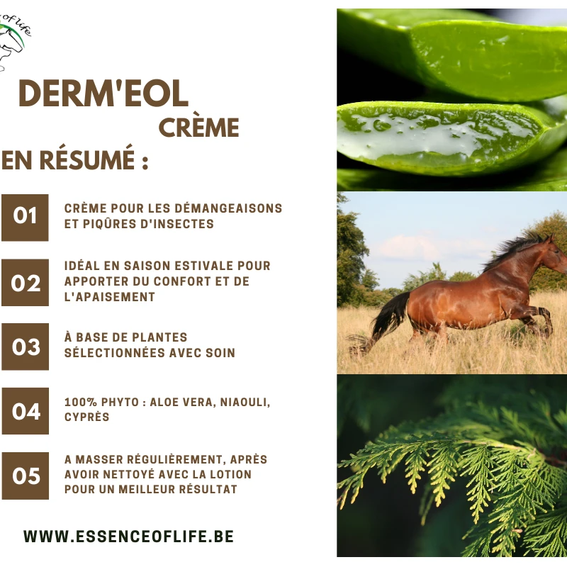 Derm’EOL Crème est une solution à toute problématique de démangeaisons cutanées, que ce soit suite à une Dermite estivale reconnue, une réaction allergique à une plante, aux insectes piqueurs de la ligne du haut et du bas, des moucherons de tout types (oreilles, plis de peau, …), aoutats de saison, … Derm’EOL Crème est une alliée de tous les jours de par sa texture non grasse, sa facilité d’utilisation et son haut pouvoir apaisant. En effet, pas besoin de gants, pas de risque de photosensibilisation, impeccable pour toute zone sensible, pas de risque d’écoulement, pénètre de manière optimale et très rapide.