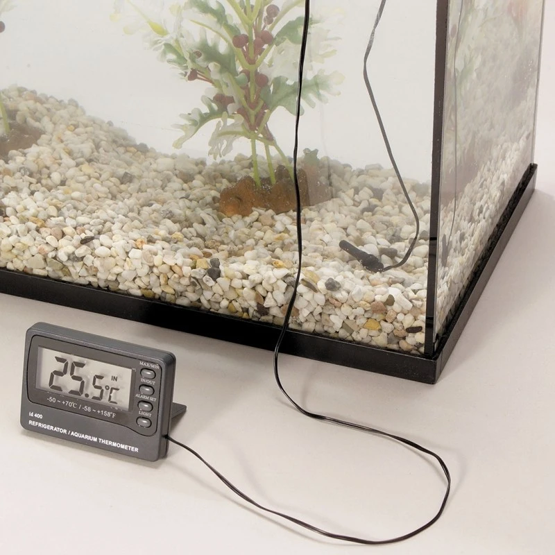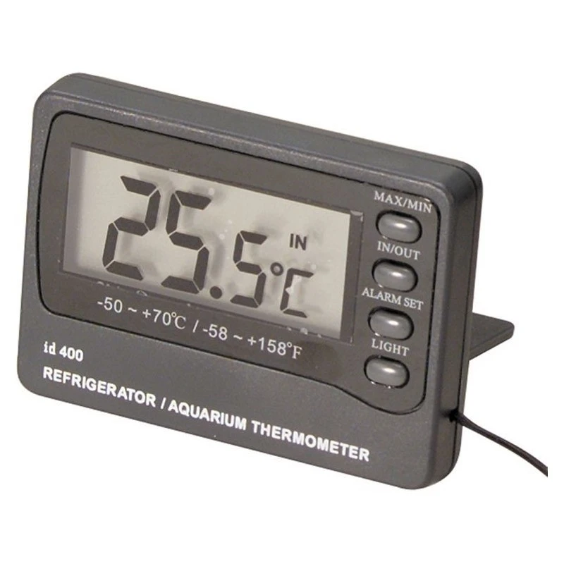 Le capteur externe est équipé d’alarmes HIGH et LOW et d’une mémoire de programmation des températures MAXIMALES et MINIMALES. La température est affichée sur un grand écran rétro-éclairé. L’appareil peut être détaché à l’aide du support ou être fixé à un aquarium ou autre à l’aide de velcro. Batterie incluse.