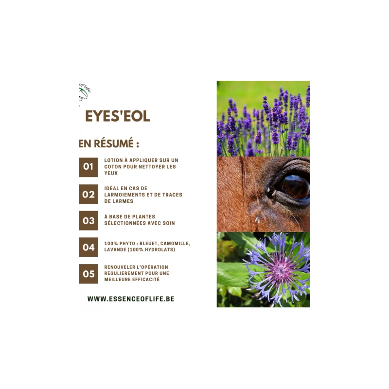EyesâEOL est une lotion douce et apaisante pour les yeux. Bien plus quâun simple nettoyage des yeux, EyesâEOL vous offre une solution prĂȘte Ă lâemploi pour apaiser les yeux gonflĂ©s de votre cheval, pour nettoyer en douceur des Ă©coulements intempestifs dus aux mouches, Ă la poussiĂšre ou autre (allergie, tĂȘte dans le foin, pollen, Ćil rouge, sensibilitĂ© au vent, au froid, âŠ) EyesâEOL est surtout une solution 100% naturelle, composĂ©e UNIQUEMENT dâhydrolats de Camomille, Bleuet & Lavande. Câest donc un soin Ă part entiĂšre pour le bien ĂȘtre de votre chevalâŠ