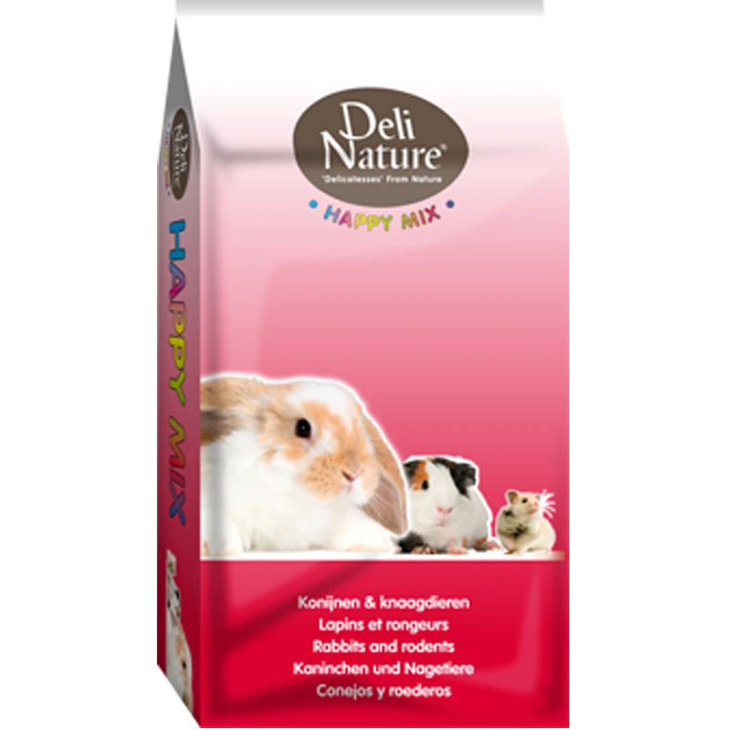 -    Le mélange Happy Mix pour lapins (nains) ne contient pas moins de 10 % de caroube et des grains éclatés sous forme de flocons de mais, de mais soufflé et de blé gonflé.