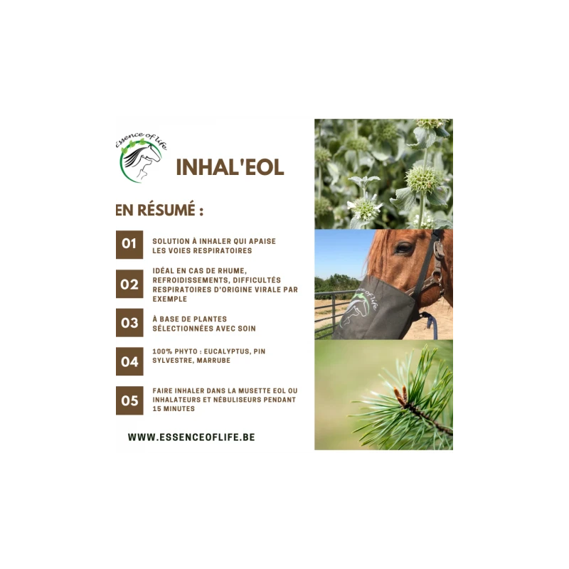 LâInhalâeol est une solutionâ Ă âinhalerâ quiâ aide âĂ â apaiser âlesâ muqueusesâ irritĂ©es, sensibles Ă la poussiĂšre et/ou au pollen. Cette solution est idĂ©alâe en âcasâ deâ rhume, ârefroidissements, âallergies ârespiratoires,â difficultĂ©s ârespiratoires, toux, jetage, des bronches rĂ©guliĂšrement encombrĂ©es, ⊠Elle permet en effet dâapporter un confort respiratoire rapide et de soulager rapidement les troubles respiratoires de votre cheval. En effet, le systĂšme respiratoire du cheval reste fragile et sensible et peut souffrir rapidement dâinconforts en fonction des saisons, de son mode de vie (box sous paille ou copeaux, prĂ©), des efforts fournis, de lâentraĂźnement, des vermifuges, des vaccins, ⊠Les maladies respiratoires du cheval peuvent rĂ©sulter dâinfections bactĂ©riennes (pneumonie, gourme) ou virales (rhino pneumonie, grippe), dâallergies (EmphysĂšme, pousse, âŠ), dâun corps Ă©tranger, de parasites, ⊠Les symptĂŽmes frĂ©quents sont de la toux, de la fiĂšvre, une intolĂ©rance Ă lâeffort, du jetage nasal, du cornage, des difficultĂ©s respiratoires, des performances en baisses, une augmentation de la frĂ©quence respiratoire, ⊠Dans tous les cas, il est toujours prĂ©fĂ©rable d’avoir un avis vĂ©tĂ©rinaire afin d’avoir un diagnostic prĂ©cis.
