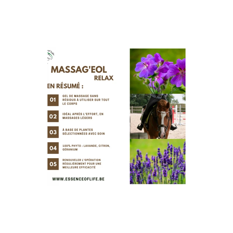Massagâeol Relax est un gel de massage innovant non gras qui ne laisse aucun rĂ©sidu. Alors pourquoi masser son cheval ? Les bienfaits du massage sur votre cheval sont multiples dont voici une petite liste. Lâavantage principal du massage est de partager un agrĂ©able moment avec votre cheval et de pouvoir dĂ©celer toute anomalie.