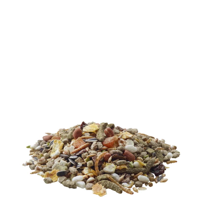 Céréales, sous-produits d’origine végétale, légumes (pois verts 12%), graines (graines de tournesol striées 6%), extraits de protéines végétales, fruits (abricot 1,5%, raisins secs 1%), noix, insectes (vers de farine 4%), substances minérales, levures, huiles et graisses, herbes, MOS, FOS, calendula, pépins de raisin
