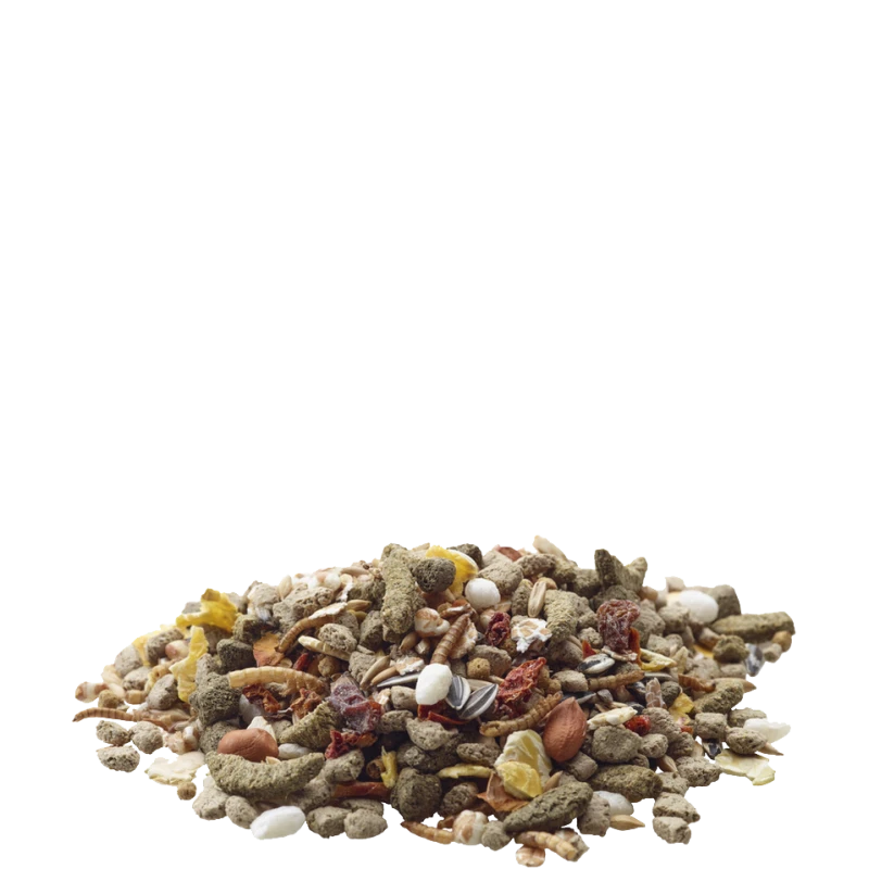 Céréales (orge 8%), sous-produits d’origine végétale, légumes (pois 8%, tomates 2%), graines, extraits de protéines végétales, fruits (papaye 2%, raisins secs 1,5%), insectes (vers de farine 4%), noix, substances minérales, levures, huiles et graisses, herbes, FOS, MOS, calendula, pépins de raisin, algues, yucca