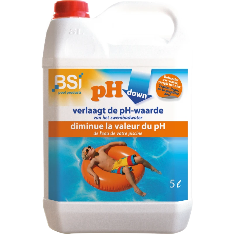Besoin d’abaisser la valeur pH de l’eau dans votre piscine ? pH Down en forme liquide est un produit qui diminue et stabilise le pH de votre piscine. Un pH trop haut peut provoquer une irritation des yeux ou de la peau et le calcaire peut rendre l’eau floue. Le degré d’acidité ou pH est une des critères les plus importantes pour rassurer une bonne qualité de l’eau. Nous recommandons d’utiliser le Test Kit ou les Test Trips de BSI pour mesurer le pH. Le pH idéal se situe entre 7,0 et 7,6. Ce produit liquide pH Down de 1 litre est la solution idéale pour diminuer le pH quand il est trop élevé. pH Down est également disponible en forme de poudre.