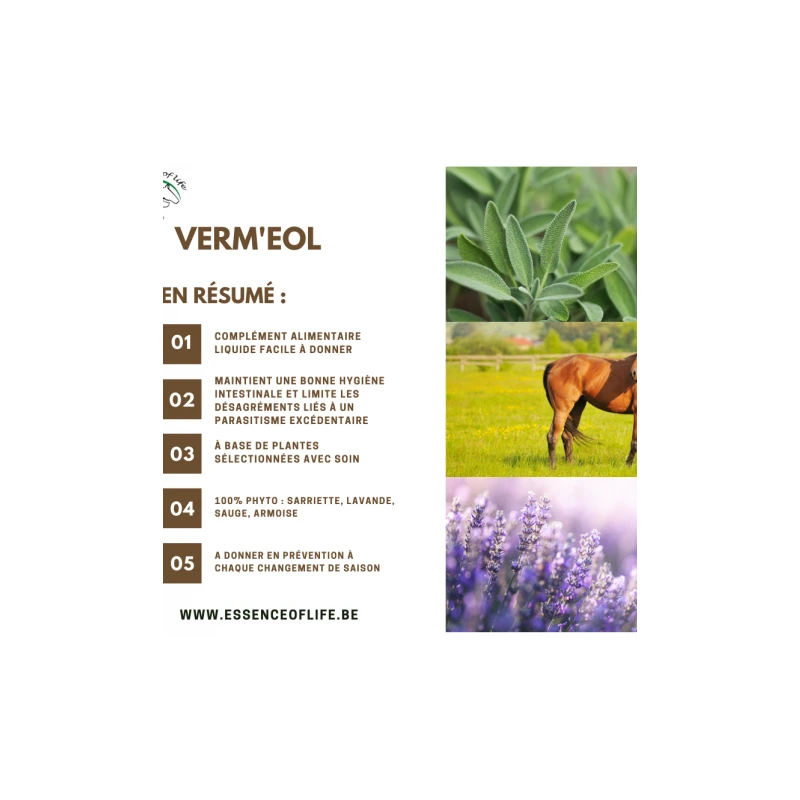 Le Verm’eol est une solution buvable qui maintient une bonne hygiène intestinale. Cette solution permet de diminuer et ceci de manière naturelle les désagréments liés à un parasitisme excédentaire.